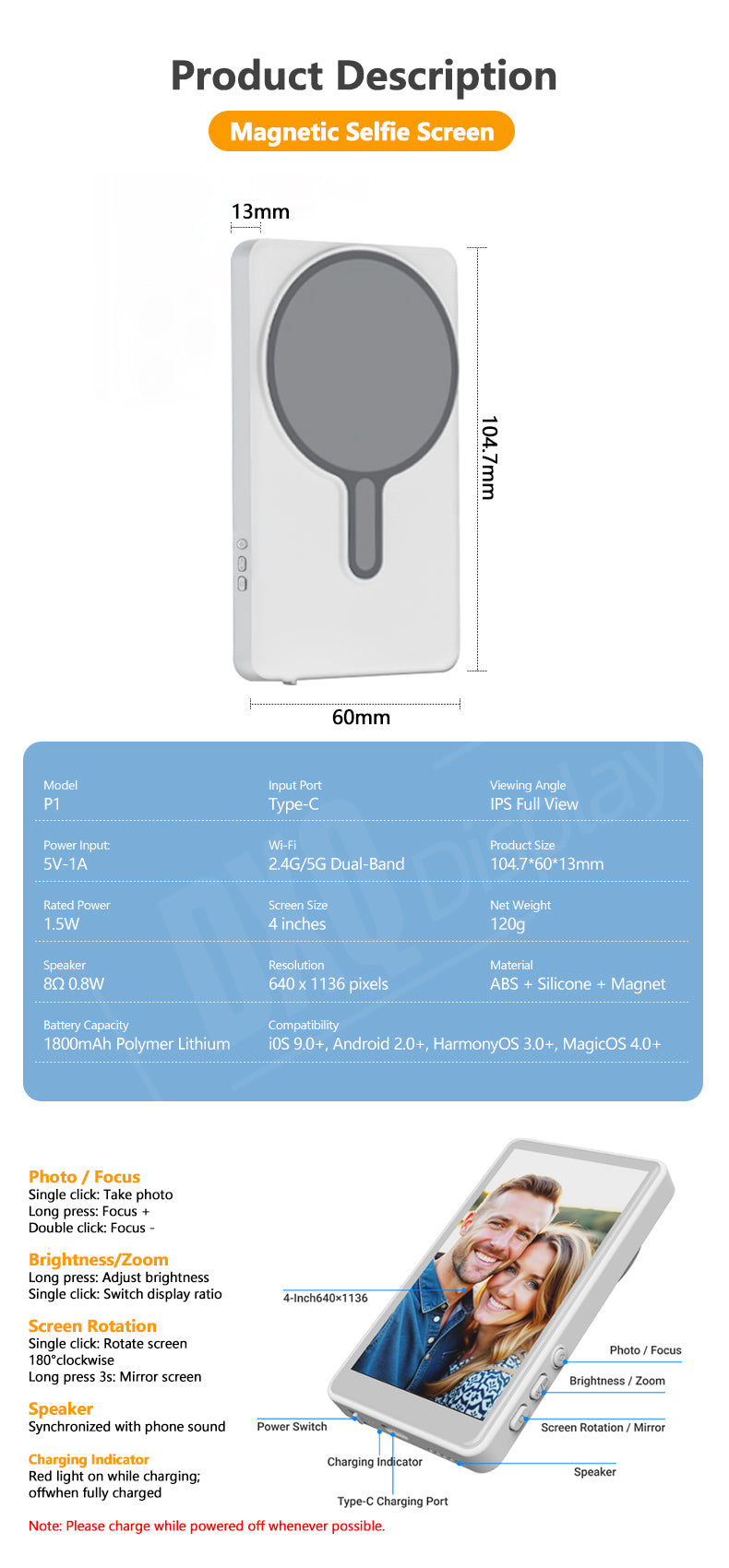 Magnetic Cell Phone Vlog Self Timer Monitor Screen Wireless Using Rear osCamera Monitor